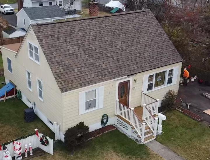 After: Production Manager Bill and crew transformed this home with brand-new IKO Dynasty Brownstone shingles, giving the roof a clean, uniform look and dependable protection built to last. Roof leak free!