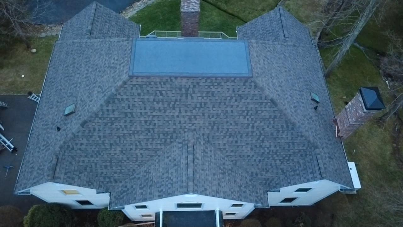 Before: This New Canaan home had worn shingles, granule loss, discoloration, and weak spots around the chimney made this roof look tired and leak-prone.