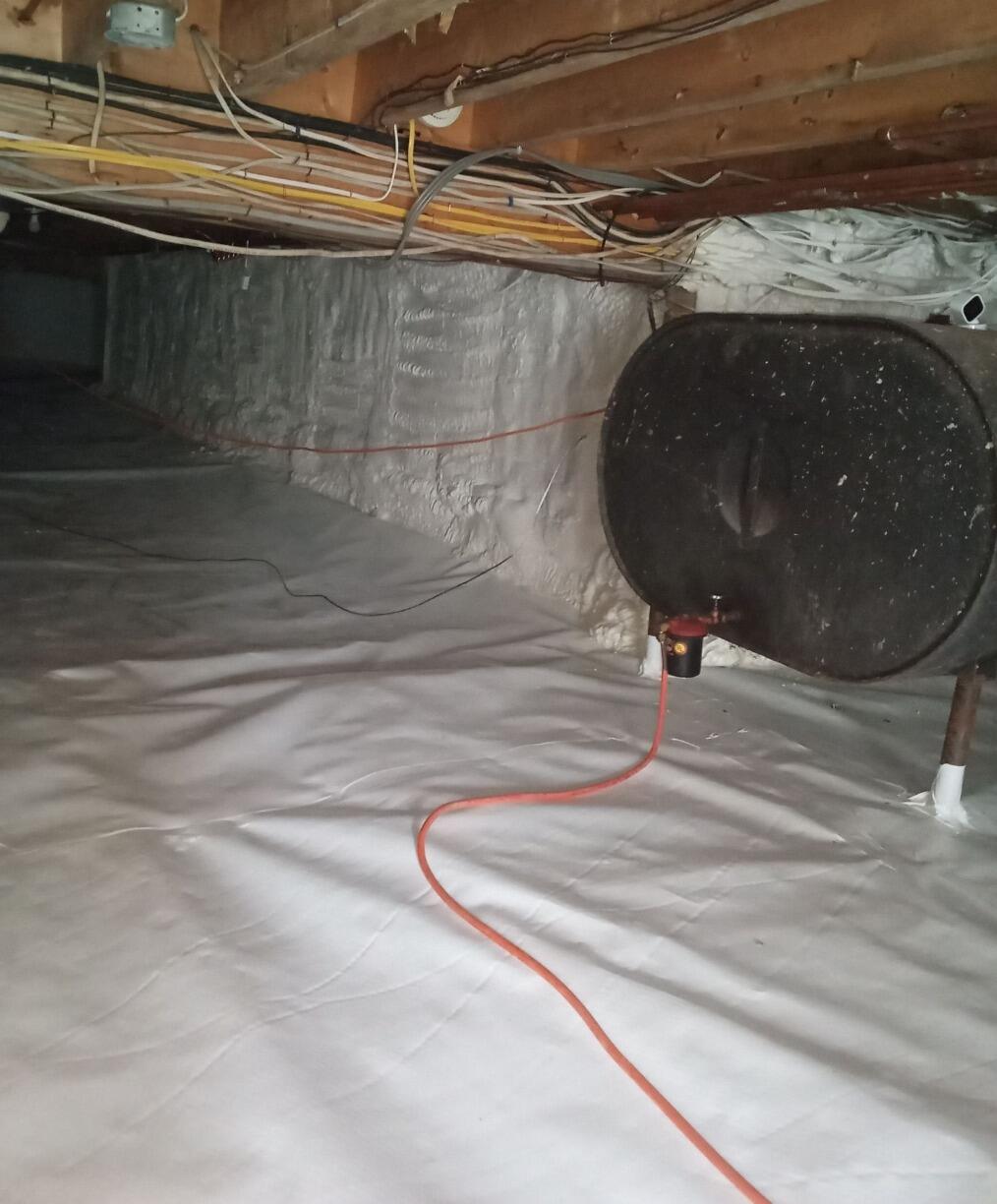 TC Hafford Basement Systems recently helped Bremen, ME homeowners with encapsulating their crawl space. Their old crawl space had dirt floors and moisture issues, causing problems with their old fiberglass insulation. We installed our two-step encapsulation system, drainage matting with a CleanSpace liner. CleanSpce is a vapor barrier that seals out moisture, and prevents mold growth. SprayFoam insulation was added on the walls and rim joists to keep an air tight seal and provide energy savings for the homeowners. Lastly, we installed a SaniDry Sedona high efficiency air system to filter the air as well as control the humidity in the crawl space.