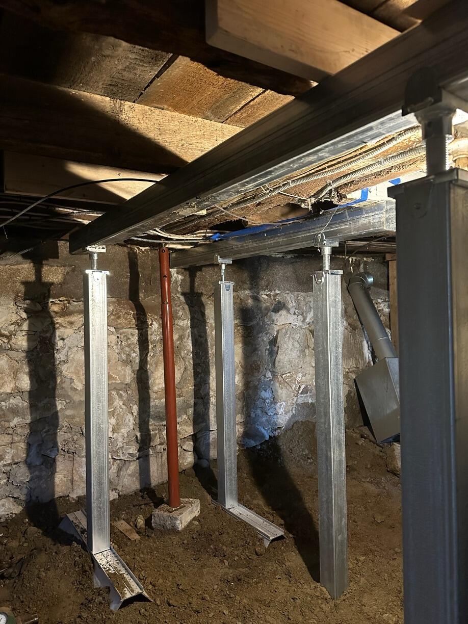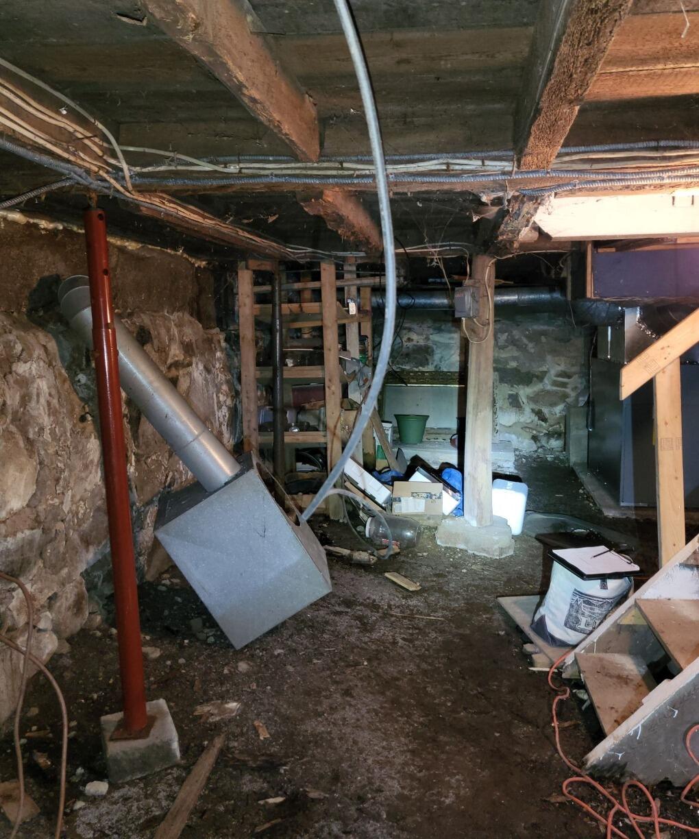 This 1800s-era Ellsworth home has a wall that’s caving in, preventing the homeowner from being able to remodel and causing dips in the first-level floors. Log joists were rotting, and lally columns were rusting, only adding to the existing problems. Ready to move on from their burdens and finally remodel their home, this Ellsworth homeowner called TC Hafford Basement Systems to schedule a free estimate to address their home issues.